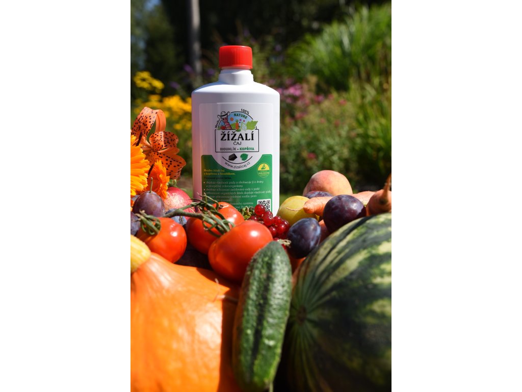 - Přírodní hnojivo vyrobené z žížalího čaje, výluhu z kopřiv a biouhlíku.